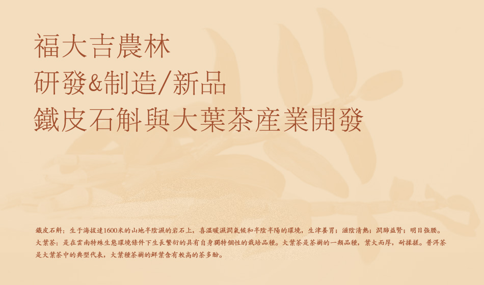 客户背景:铁皮石斛:生于海拔达1600米的山地半阴湿的岩石上,喜温暖湿润气候和半阴半阳的环境,生津养胃;滋阴清热;润肺益肾;明目强腰。大叶茶:是在云南特殊生态环境条件下生长繁衍的具有自身独特个性的栽培品种。大叶茶是茶树的一类品种,叶大而厚,耐揉搓。普洱茶是大叶茶中的典型代表,大叶种茶树的鲜叶含有较高的茶多酚。