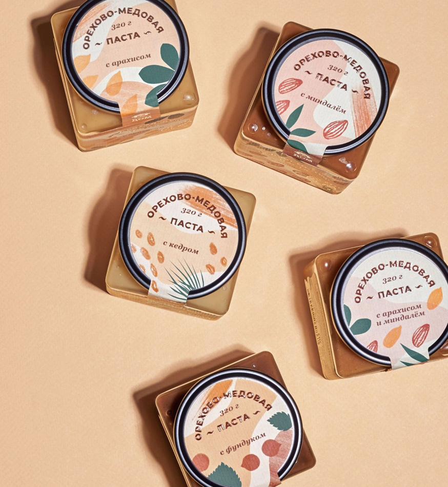 坚果和蜂蜜酱是一种新的健康美味产品,包含五种口味:松子,花生和杏仁,花生,榛子和杏仁。目的是为产品线创建品牌标签。为了强调天然风味并使产品系列与竞争对手区分开来,设计专注于颜色,图形艺术和印刷解决方案。对于每种不同的口味,用柔和的调色板为每种坚果种类创建了独特的图案。未镀膜的质感纸具有清爽的清漆触感,提供令人愉悦的触感体验,而金色的铝箔纸上的光线则唤醒了温暖的夏日夕阳下的影像,这时可以喝一杯含这种甜食的茶就不错了。