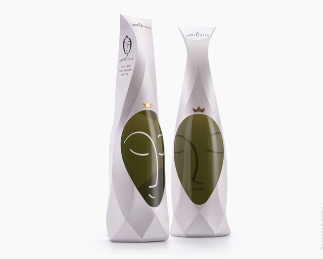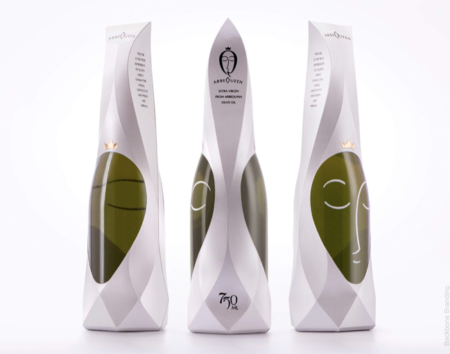 橄榄油品牌VI设计一种皇家头饰的效果,透过它可以看到橄榄形的瓶子,上面刻有女王脸的精美图案,由一整张纸制成。它旨在成为人们日常生活中的美丽装饰品。