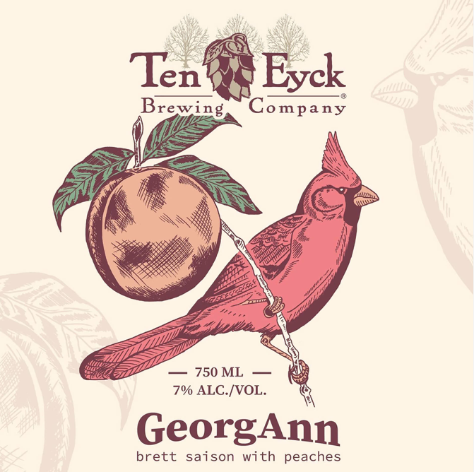 啤酒标签设计的特点是传统上用钢笔和墨水绘制的红衣主教手绘插图。这只鸟代表着酿酒厂老板的姑姑乔治安,而桃子则吸引你去品尝这个软木塞和笼子里的味道!