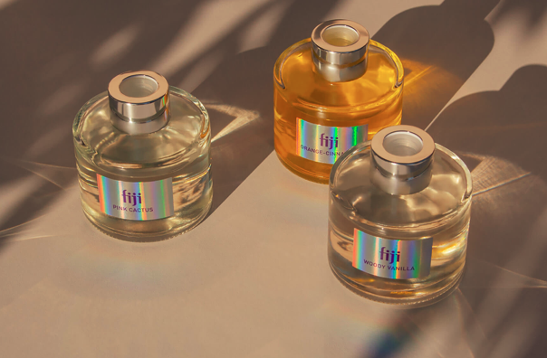 FIJI这个品牌标志设计是一个关于天堂岛、飘扬的异国蝴蝶、蓝色泻湖、温和的南风的故事——所有这些都是关于有尊严地缓慢生活的故事。热带日落的浪漫由全息箔传达,该箔根据视角以不同的渐变色调“闪耀”,变成货架上的珠光“眼塞”。每种香气都有自己的颜色和数字代码。类似蒸馏药房的极简主义包装倾向于香水设计,这增加了产品对消费者的视觉价值。